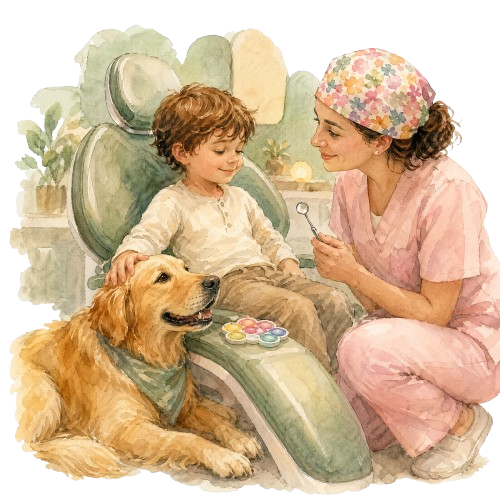 Des chiens spécialement formés peuvent jouer un rôle considérable dans l’apaisement des patients. Leur présence calme, leur chaleur, leur absence de jugement permettent de réduire significativement l’anxiété en salle d’attente et parfois même pendant le soin. Dans le premier cabinet dentaire français entièrement dédié aux personnes en situation de handicap : enfants trisomiques, autistes, patients à mobilité réduite, il y a un petit chien. Il est parfaitement conscient de son rôle, et le remplit avec attention ! Et il s’appelle « Toubib »… c’est tout dire !